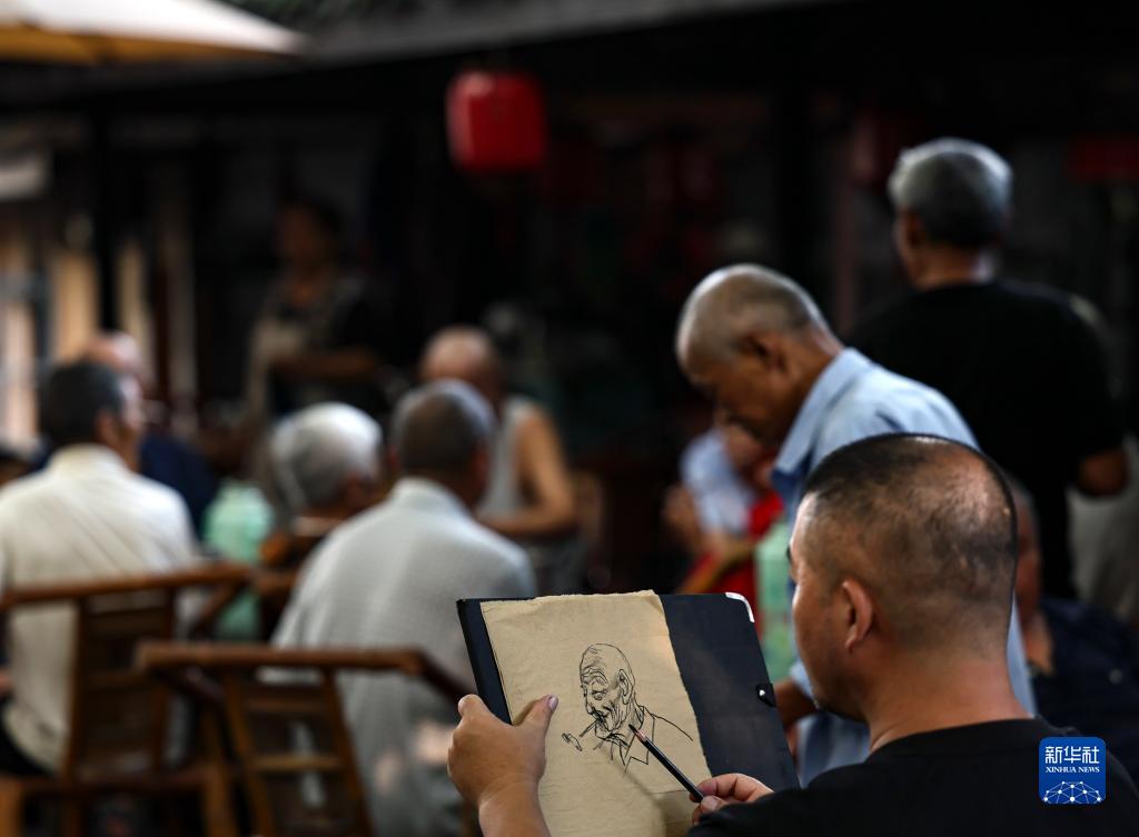 一位畫(huà)家為喝茶休閑的老人畫(huà)像(8月7日攝)。