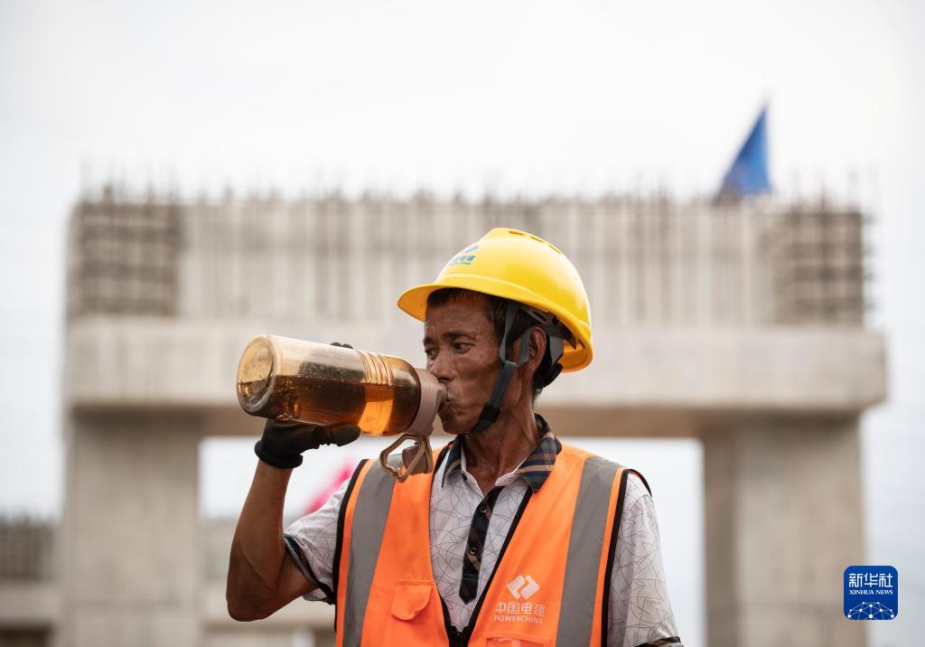 8月14日,建設人員在以色列特拉維夫輕軌綠線(xiàn)G3-4標段工程施工現場(chǎng)作業(yè)的間隙喝水。