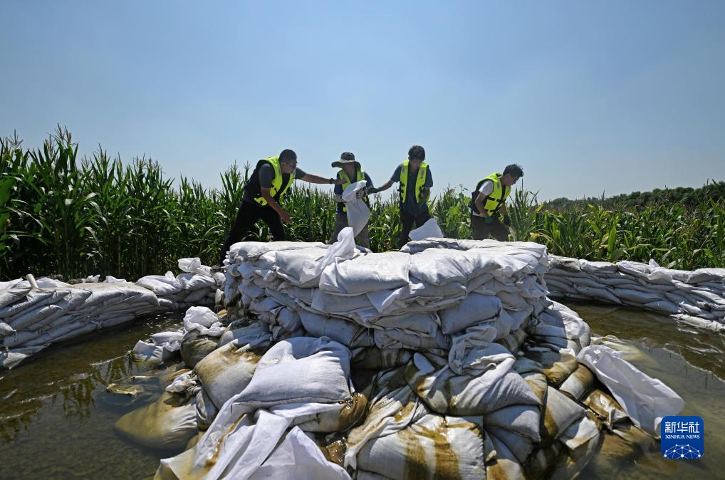8月15日,在天津市靜海區臺頭鎮清北地區北圍埝附近,應急搶險隊在搬運沙袋處置堤壩滲水。
