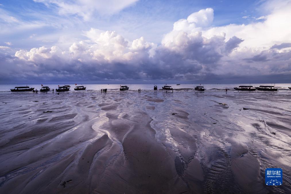 清晨,迅速變化的光線(xiàn)和云彩、來(lái)來(lái)往往的游客、聞雞起舞的漁人以及奔騰不息的波浪,在廣西東興的金灘上一起奏響了一首美妙的樂(lè )曲。
