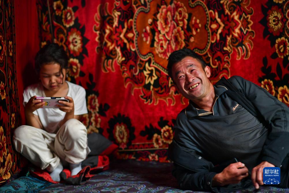 在新疆昌吉市廟爾溝鄉索爾巴斯陶牧場(chǎng)上,牧民木合塔爾(右)和女兒在房間內休息(8月14日攝)。