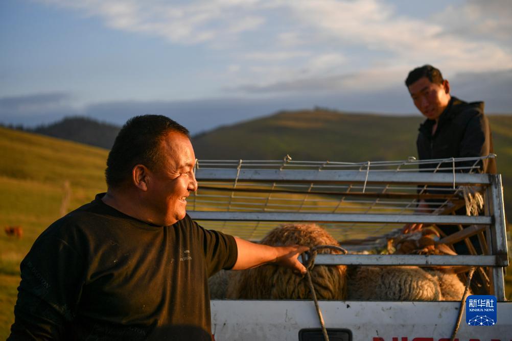 一名商戶(hù)(左)在索爾巴斯陶牧場(chǎng)上收購羊羔(8月13日攝)。