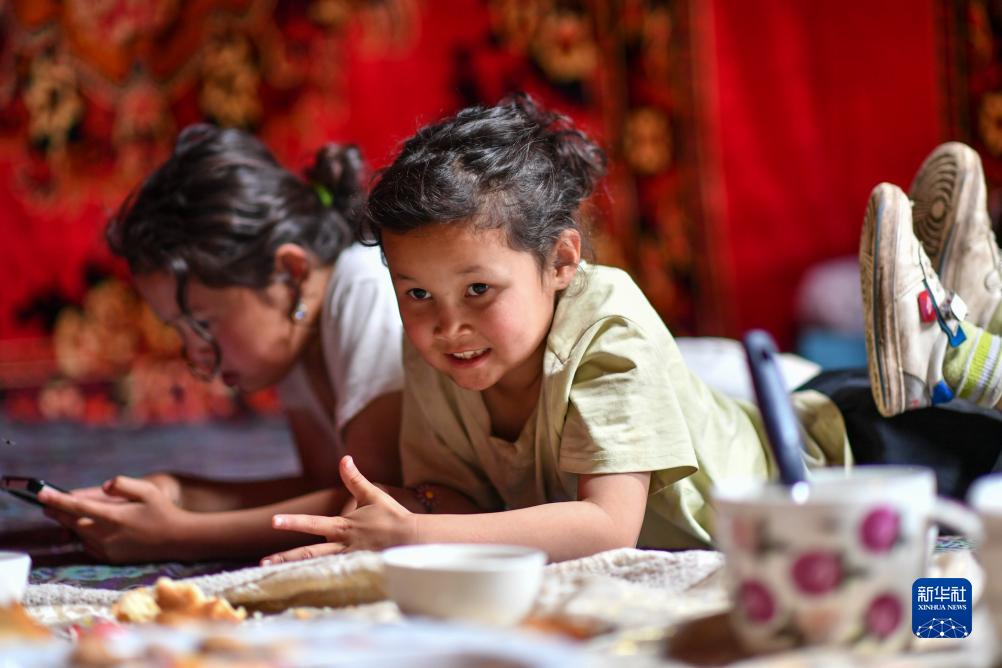 在索爾巴斯陶牧場(chǎng)過(guò)暑假的艾麗達(右)和姐姐在房間內玩耍(8月14日攝)。