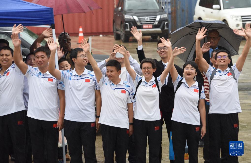 8月15日,中國援瓦醫療隊隊員在瓦努阿圖維拉港為中國海軍“和平方舟”號醫院船送行。