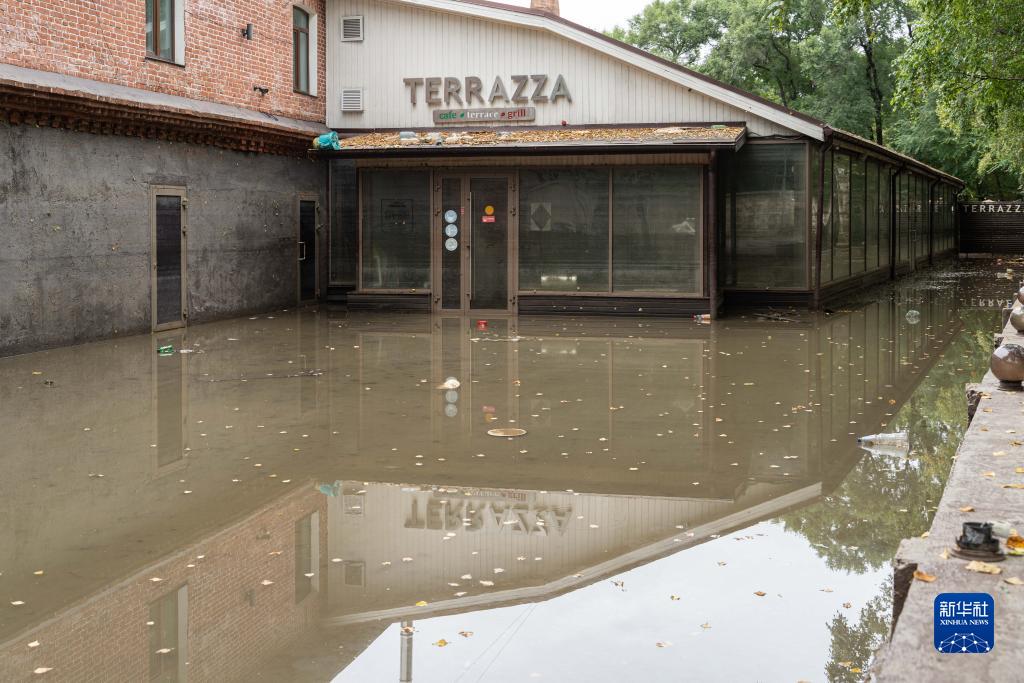 這是8月15日在俄羅斯烏蘇里斯克市拍攝的被洪水圍困的一家餐廳。