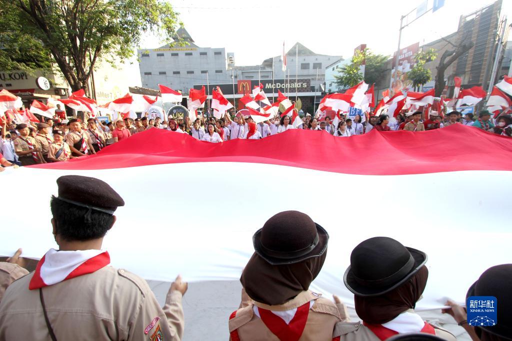 8月13日,在印度尼西亞梭羅,學(xué)生們在街頭舉著(zhù)巨幅印尼國旗迎接獨立日。