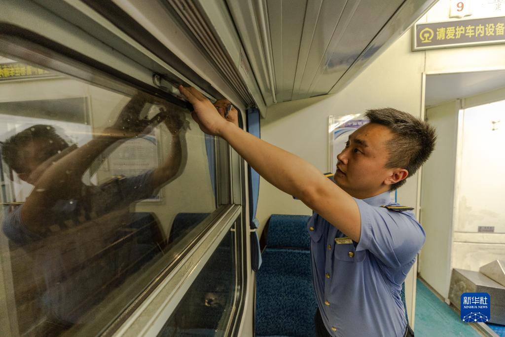 8月15日,重慶客運段列車(chē)長(cháng)任煉在重慶西客車(chē)整備所對全列車(chē)窗鎖閉情況進(jìn)行檢查。