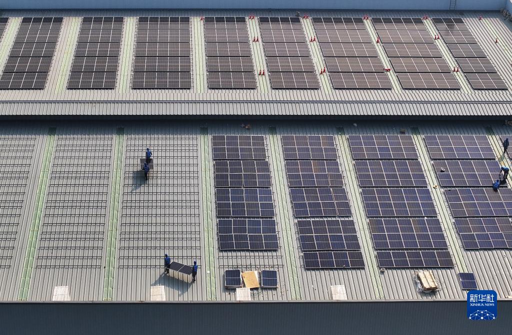 8月16日,工人在唐山市海港經(jīng)濟開(kāi)發(fā)區一企業(yè)的廠(chǎng)房屋頂安裝太陽(yáng)能光伏發(fā)電板(無(wú)人機照片)。