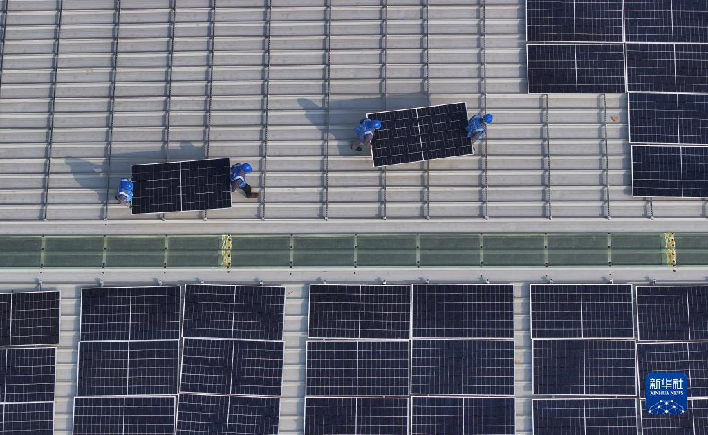 連日來(lái),在河北省唐山市海港經(jīng)濟開(kāi)發(fā)區各企業(yè)的廠(chǎng)房屋頂,工人搶抓工期,安裝光伏發(fā)電板,現場(chǎng)一片忙碌景象。