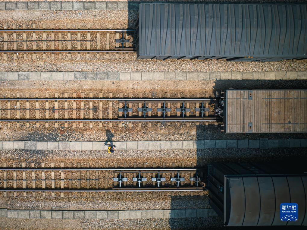 8月16日,鐵路喬司編組站的調車(chē)員走向貨車(chē)車(chē)廂準備進(jìn)行調車(chē)作業(yè)(無(wú)人機照片)。