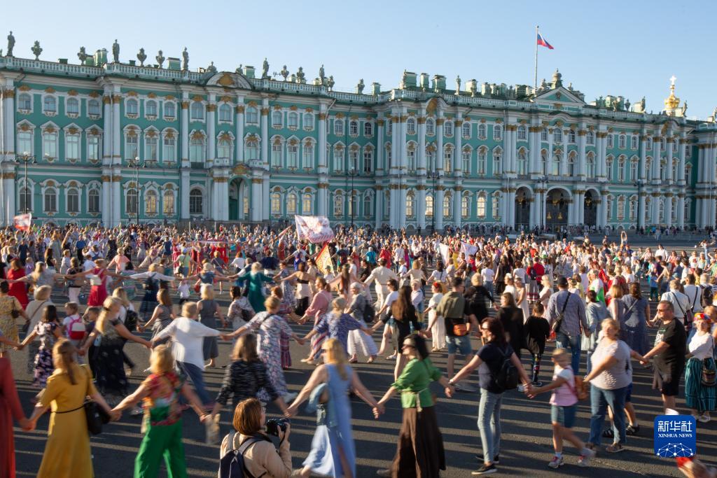 8月15日,民眾在俄羅斯圣彼得堡冬宮廣場(chǎng)跳圓圈舞。