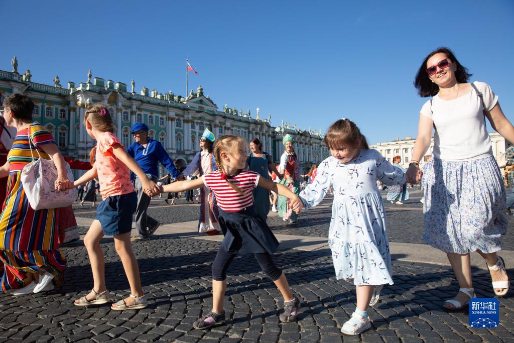 8月15日,民眾在俄羅斯圣彼得堡冬宮廣場(chǎng)跳圓圈舞。