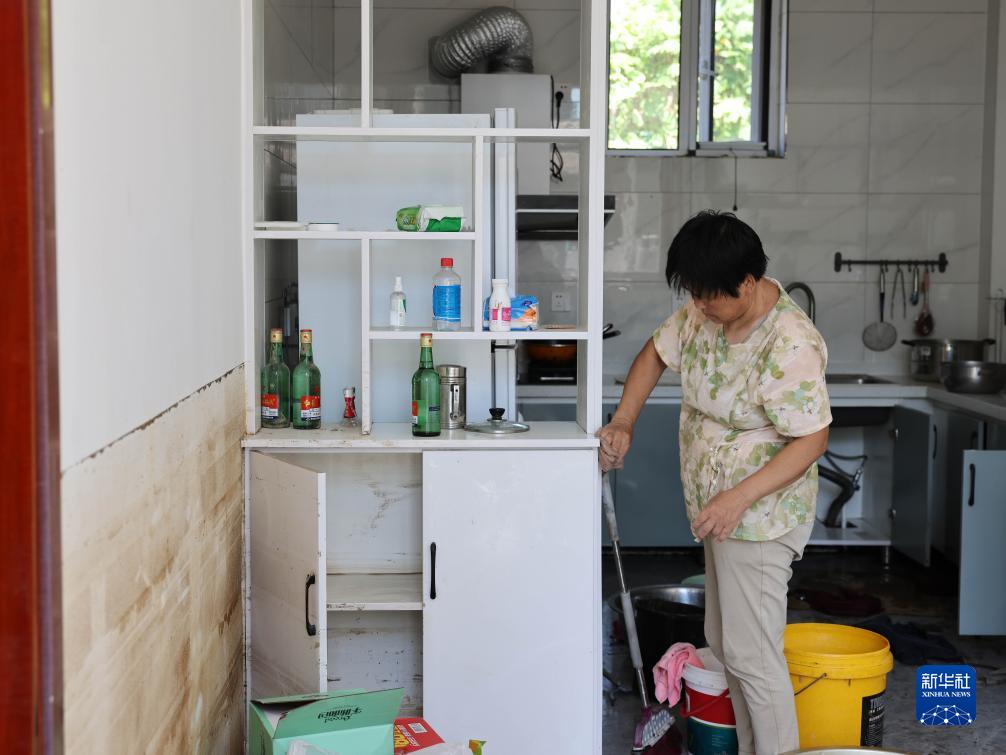 8月16日,河北淶水縣九龍鎮北龍門(mén)村村民在收拾清理家中物品。