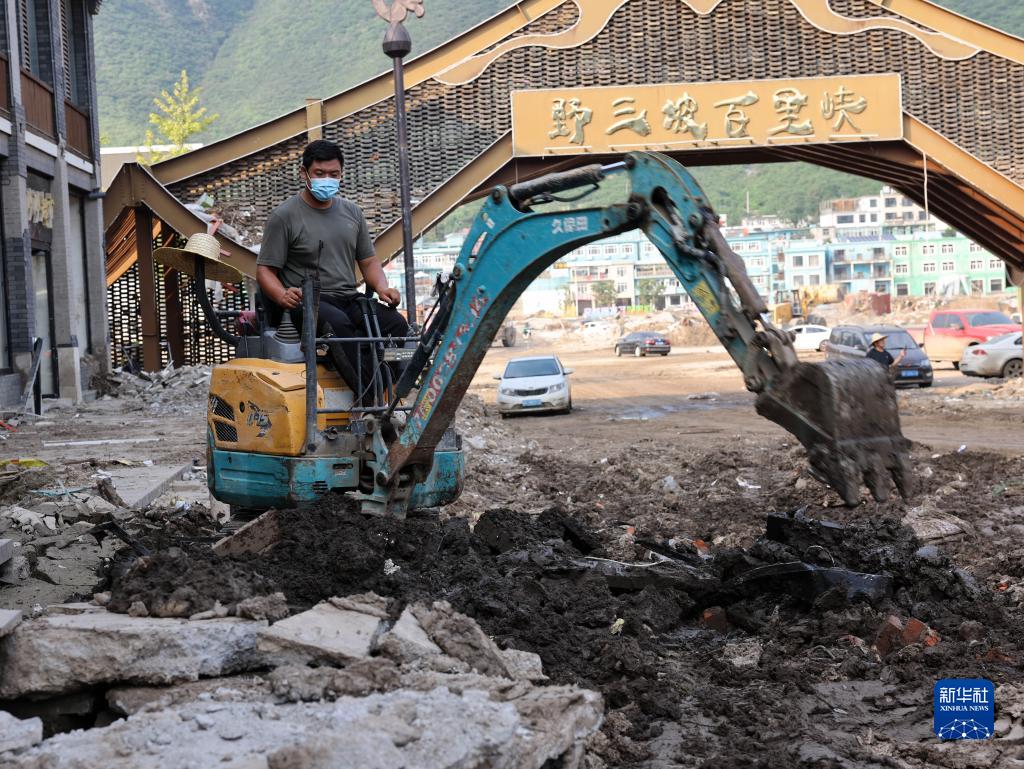 8月15日,工作人員駕駛機械在河北淶水縣野三坡百里峽景區清理排水溝。