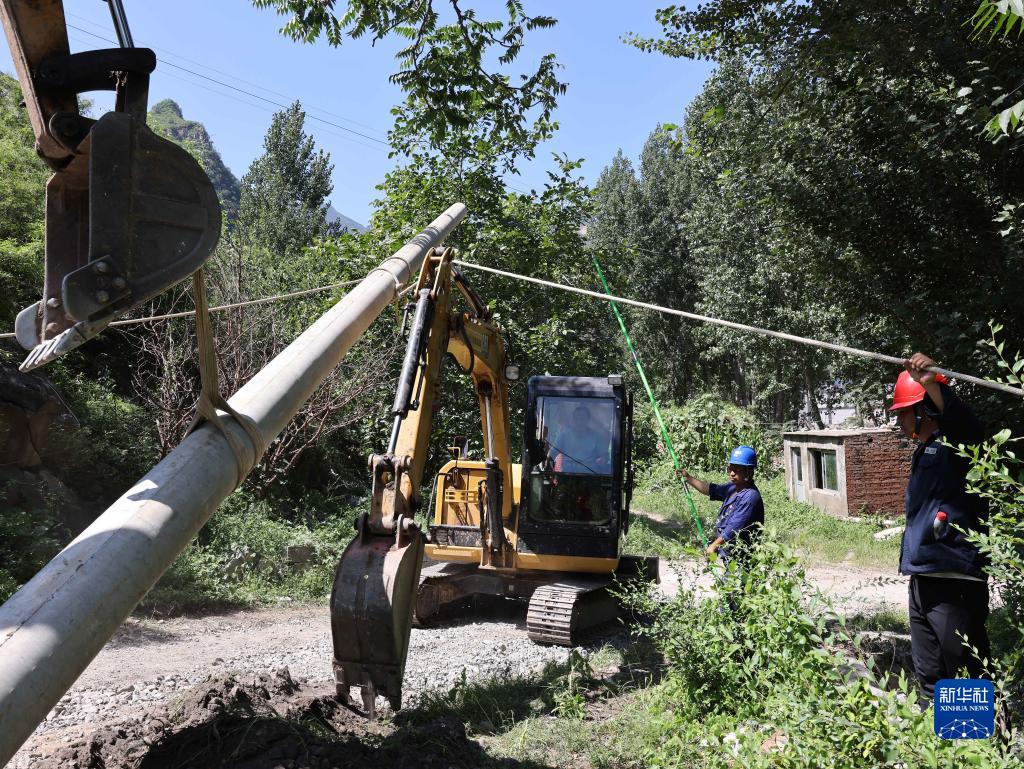 8月16日,電力公司施工人員在河北淶水縣九龍鎮北龍門(mén)村搶修電力設施。