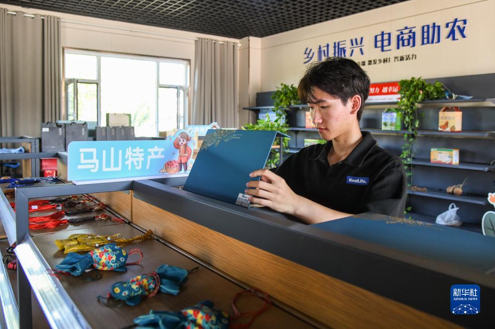 8月15日,工作人員在馬山鎮電商服務(wù)中心內整理貨品。