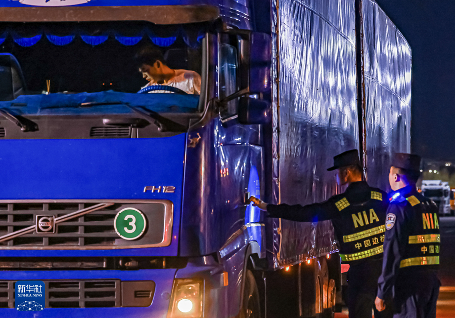 8月15日,霍爾果斯出入境邊防檢查站民警對出境車(chē)輛進(jìn)行查驗。