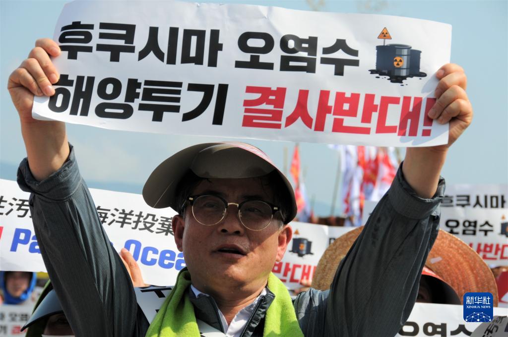 8月16日,在韓國全羅南道高興郡沿海一帶,韓國漁民手持標語(yǔ)參加集會(huì )活動(dòng),抗議日本核污染水排海計劃。