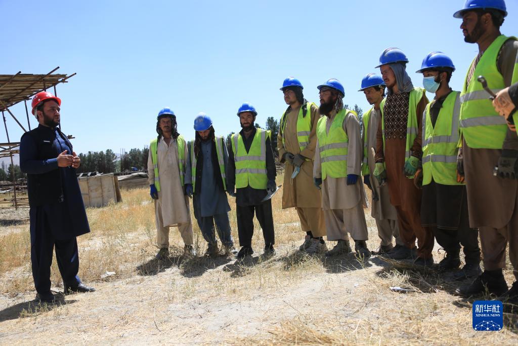 8月13日,努爾·阿齊茲(左一)在喀布爾西郊一處中企承建項目工地指導當地工人工作。