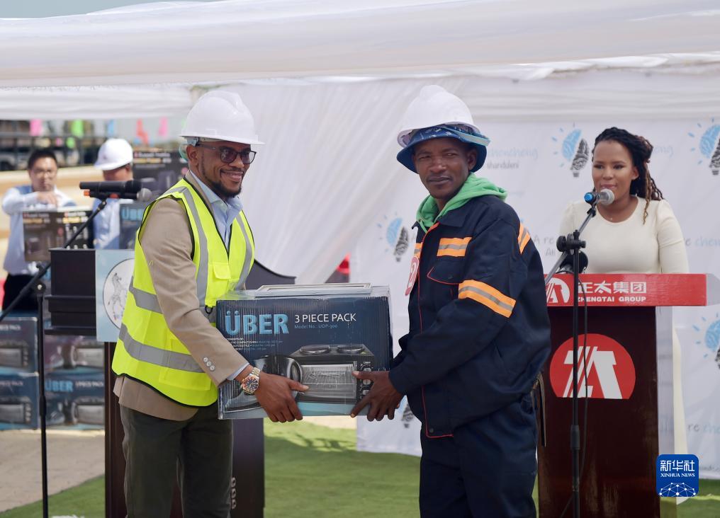 8月15日,在博茨瓦納莫舒帕,一名當地員工(前右)在正太集團舉辦的員工技能大賽上領(lǐng)獎。