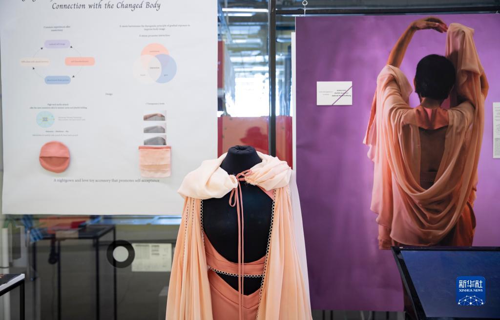 這是8月15日在以色列比撒列藝術(shù)設計學(xué)院畢業(yè)展上拍攝的為乳腺癌患者設計的睡衣。
