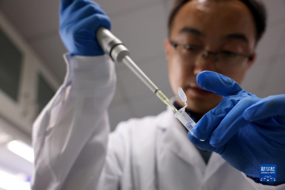 在中國科學(xué)院天津工業(yè)生物技術(shù)研究所實(shí)驗室,楊建剛副研究員在做人工合成己糖實(shí)驗(8月13日攝)。