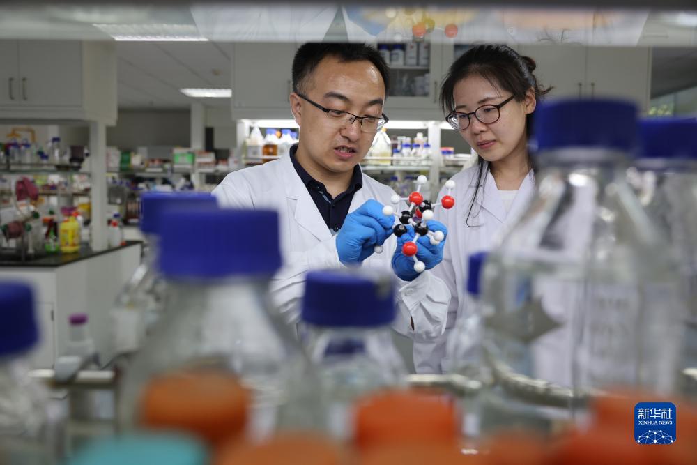 在中國科學(xué)院天津工業(yè)生物技術(shù)研究所實(shí)驗室,楊建剛副研究員(左)和宋皖博士在討論工作進(jìn)展(8月13日攝)。