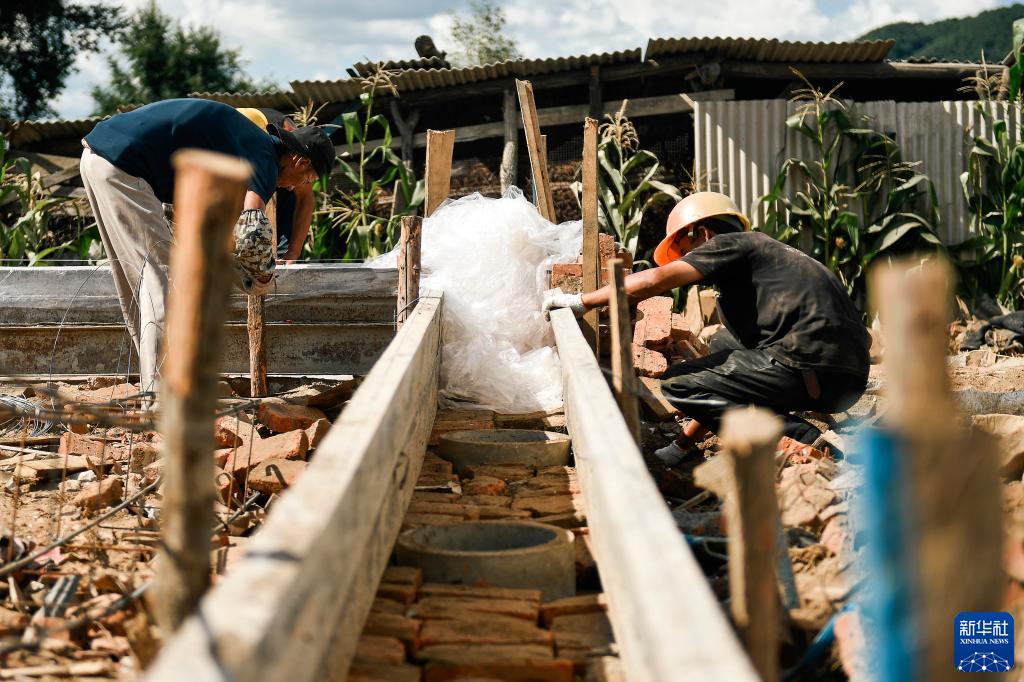 工作人員對舒蘭市開(kāi)原鎮模范村的受損房屋進(jìn)行重建工作(8月16日攝)。