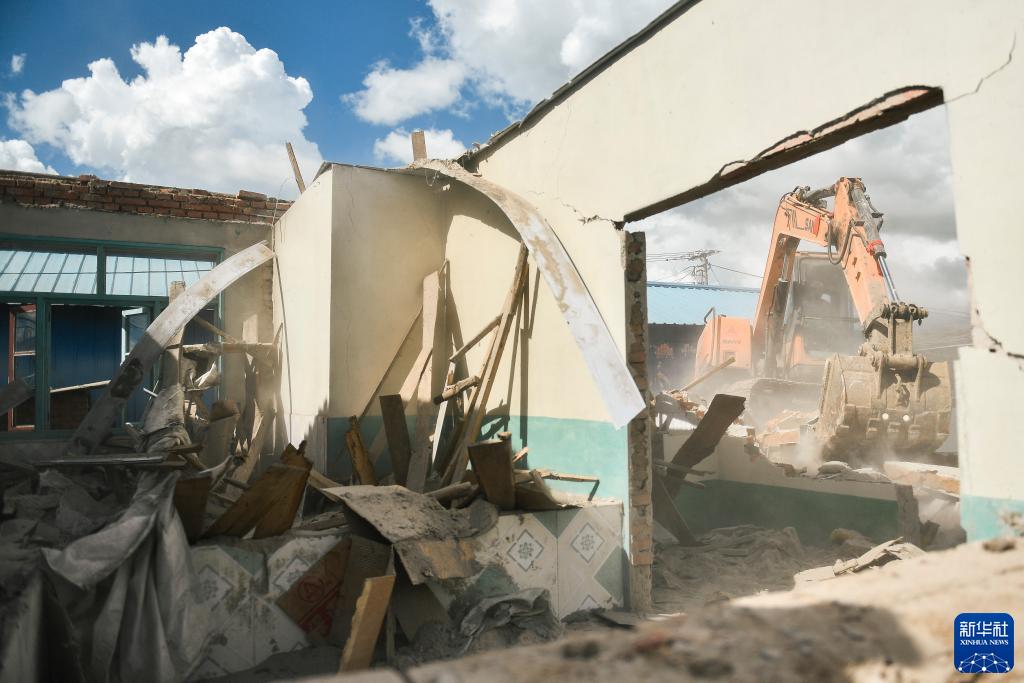 工作人員對舒蘭市開(kāi)原鎮模范村的受損房屋進(jìn)行拆除重建工作(8月16日攝)。