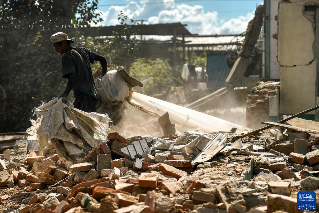 工作人員對舒蘭市開(kāi)原鎮模范村的受損房屋進(jìn)行拆除重建工作(8月16日攝)。