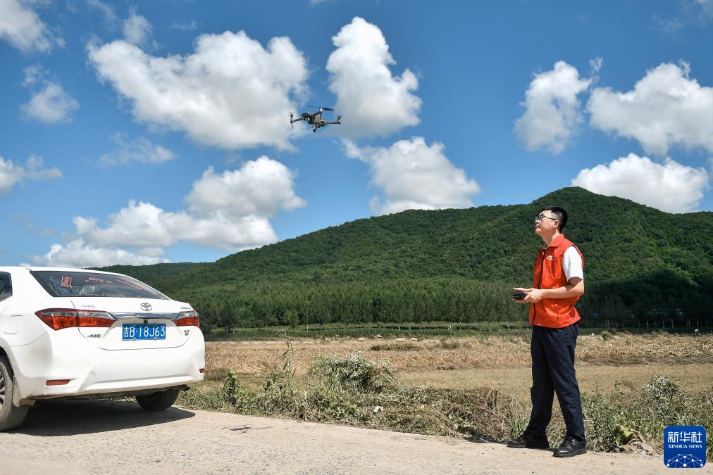 農業(yè)保險理賠人員使用無(wú)人機查看舒蘭市金馬鎮周邊農田受災情況(8月15日攝)。
