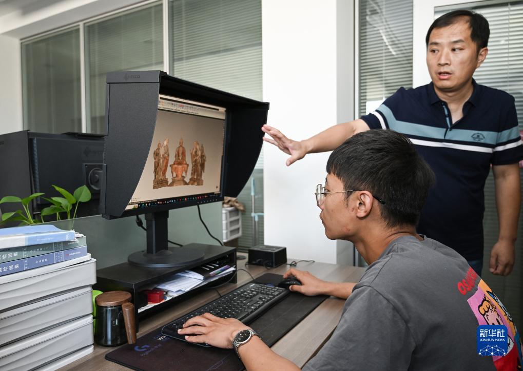 在敦煌研究院文物數字化研究所內,工作人員展示對莫高窟彩塑進(jìn)行三維重建后的成果(8月3日攝)。