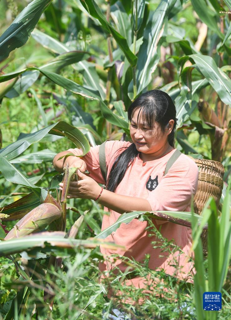 8月16日,村民在重慶市石柱土家族自治縣王家鄉光華村采摘玉米。