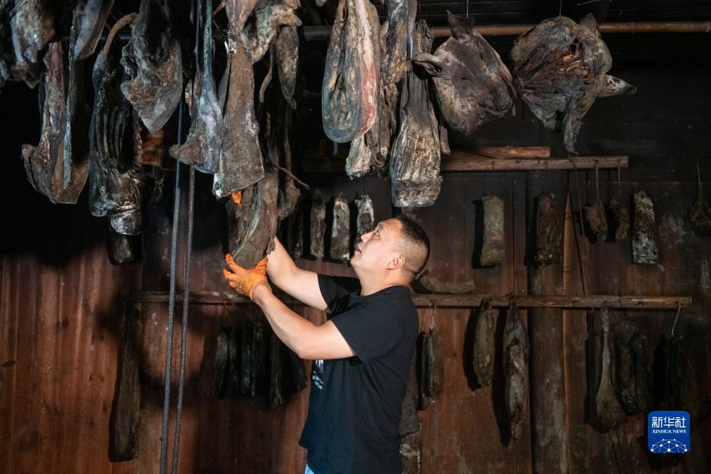 下坪鄉東洲村村民田一民在家中整理臘肉(8月17日攝)。田一民和兩個(gè)兄弟一起,圍繞自家的院落,打造“三兄弟臘肉”土特產(chǎn)品牌,并通過(guò)網(wǎng)絡(luò )把村里的土家臘肉、茶葉等特色農產(chǎn)品賣(mài)出大山。