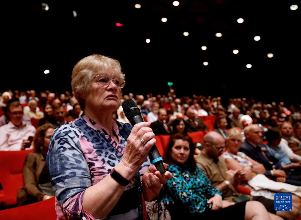 8月15日,在英國倫敦,“里斯本丸”號幸存者丹尼斯·莫利之女丹妮絲·維尼在放映活動(dòng)上與主創(chuàng )人員交流。