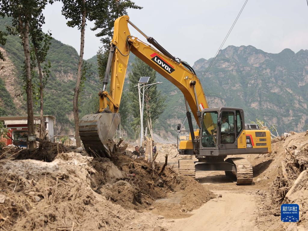 8月17日,工作人員駕駛機械在河北省保定市淶水縣趙各莊鎮平峪村清理進(jìn)村道路。