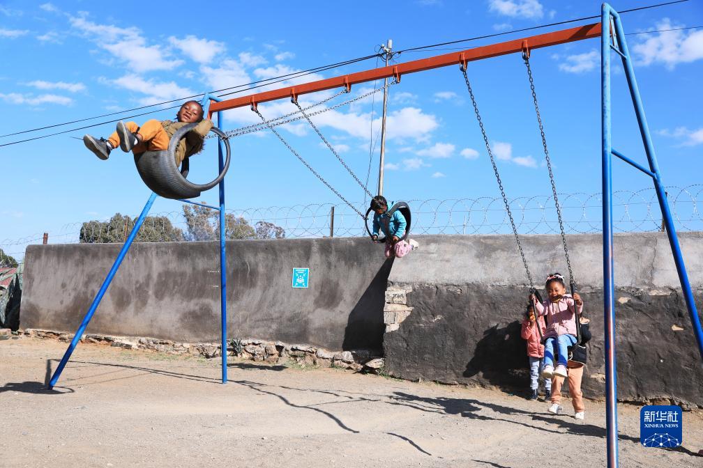 8月11日,孩子們在南非德阿鎮的一家兒童早教中心蕩秋千。