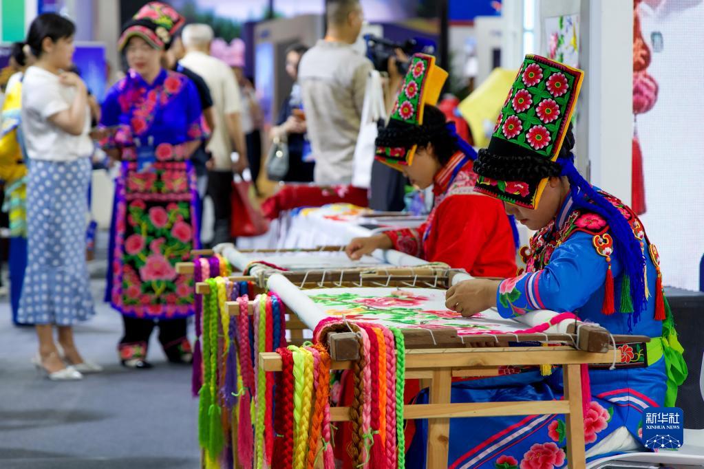 8月17日,在產(chǎn)業(yè)成果館漢中展區,非遺傳承人展示刺繡技藝。