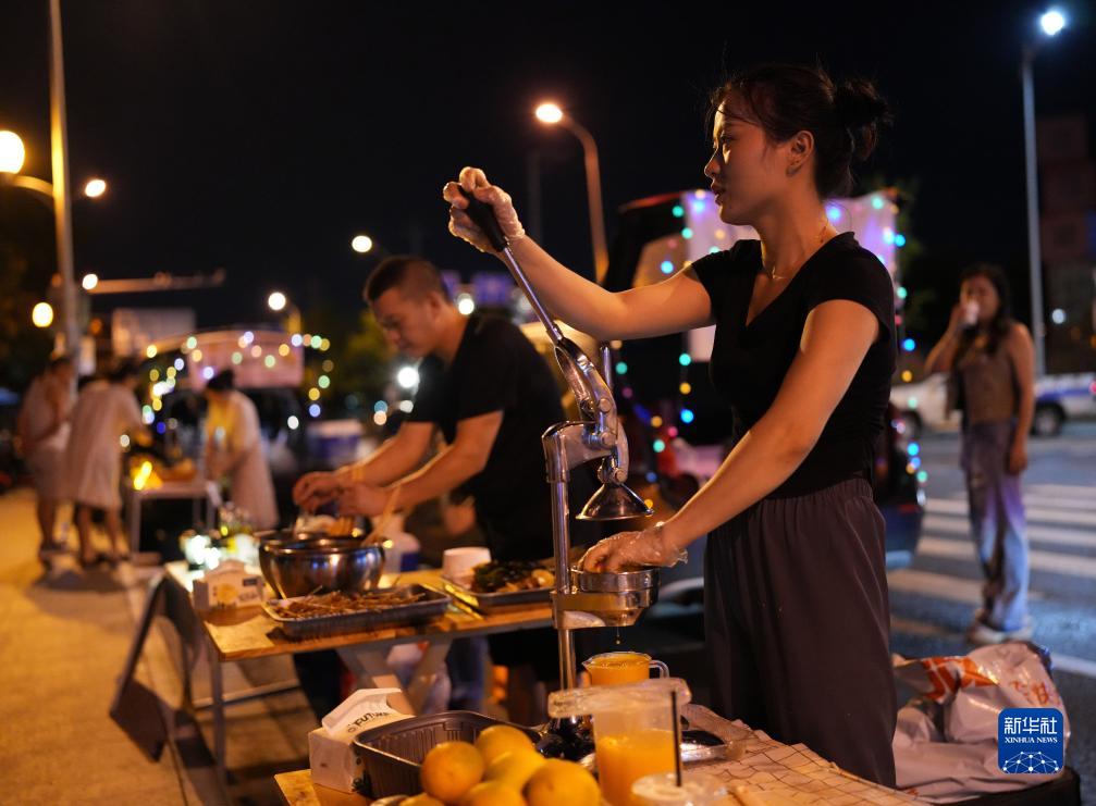 8月17日,浙江省紹興市越城區五云北路后備箱集市一名攤主為顧客榨果汁。
