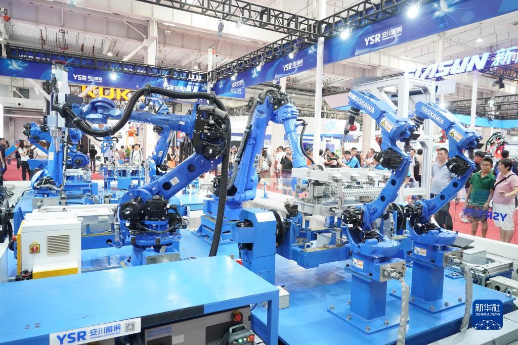 這是在2023世界機器人大會(huì )現場(chǎng)拍攝的新能源電池盒機器人智能生產(chǎn)線(xiàn)(8月17日攝)。