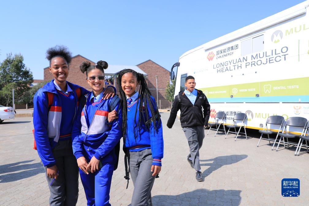 8月10日,在南非德阿鎮一所學(xué)校,學(xué)生在醫療大巴車(chē)前合影。