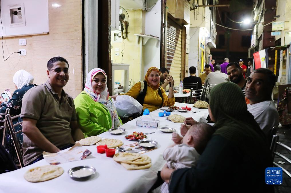 人們在埃及開(kāi)羅哈里里市場(chǎng)夜市的一家餐廳用餐(7月28日攝)。