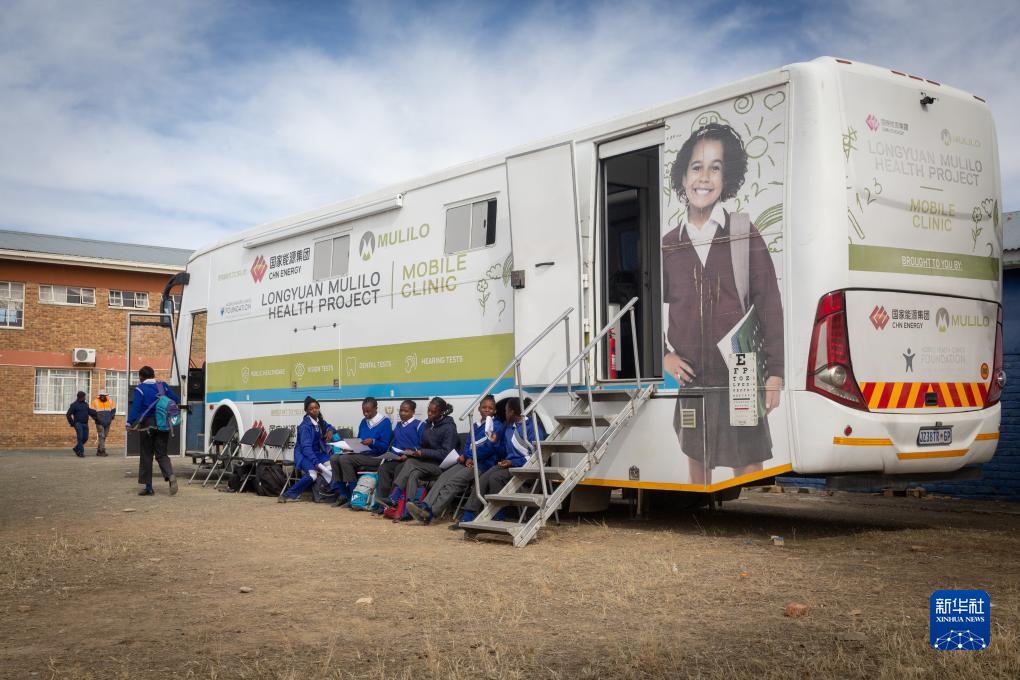 7月25日,在南非北開(kāi)普省德阿鎮,學(xué)生在龍源南非公司購買(mǎi)的醫療大巴車(chē)前排隊等待檢查。