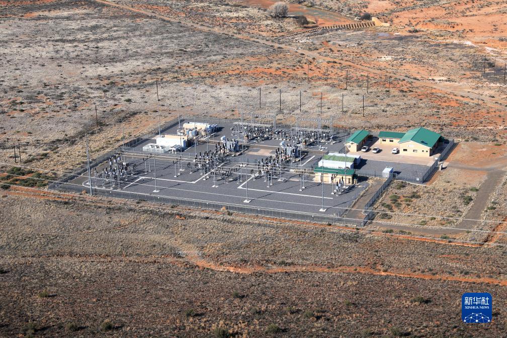 這是8月10日在南非北開(kāi)普省德阿鎮拍攝的龍源南非公司德阿風(fēng)電項目變電站。