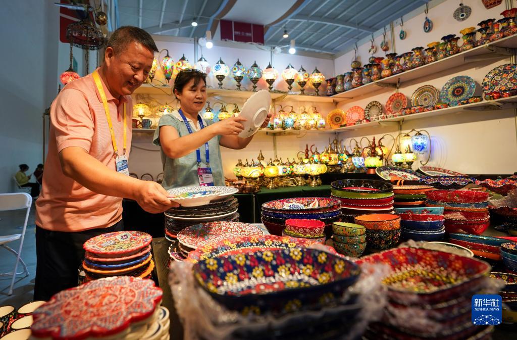 參觀(guān)者(左)在一個(gè)售賣(mài)土耳其瓷器的展位上挑選瓷盤(pán)(8月16日攝)。