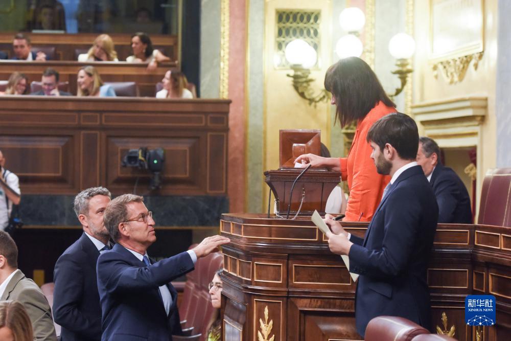 8月17日,在西班牙馬德里,人民黨領(lǐng)導人阿爾韋托·努涅斯·費霍(前左)在議會(huì )進(jìn)行投票。