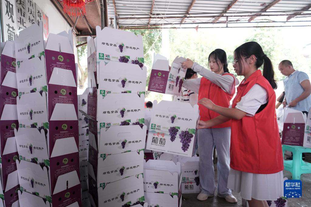 8月18日,在重慶市北碚區靜觀(guān)鎮奇峰葡萄園,西南大學(xué)學(xué)生在幫助果農整理葡萄包裝箱。