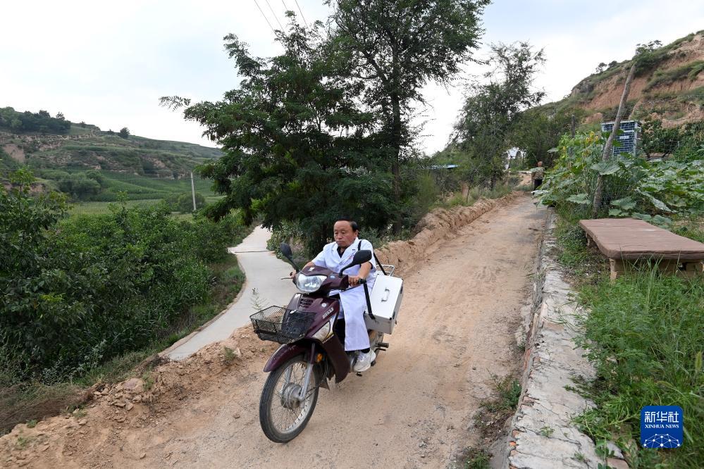 村醫楊興榮騎著(zhù)摩托車(chē)前往王家溝村出診(8月15日攝)。