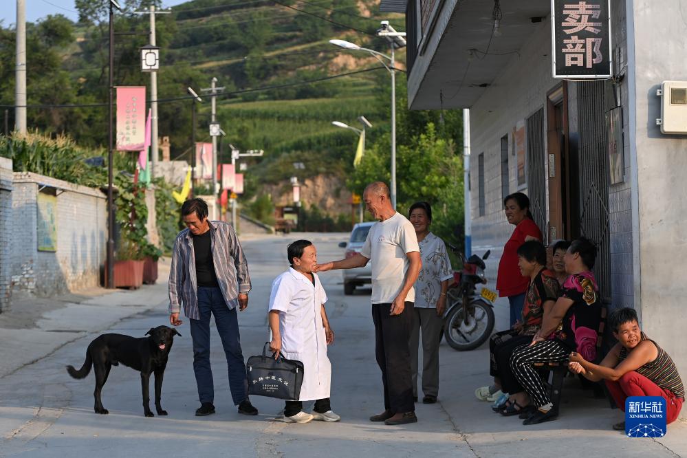 在石樓縣龍交鄉王家溝村,鄉村醫生楊興榮(左二)和村民聊天(8月14日攝)。