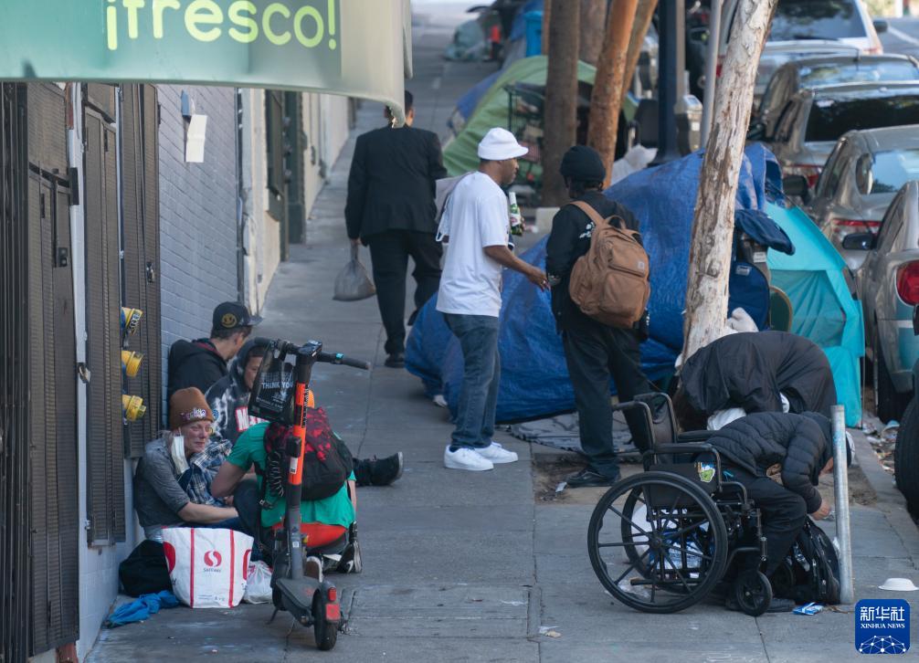 這是8月18日在美國加州舊金山市區的街道上拍攝的無(wú)家可歸者。